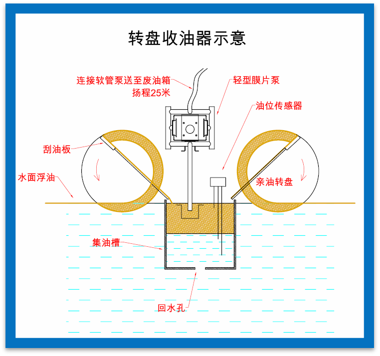 浮動轉(zhuǎn)盤收油器包括集油轉(zhuǎn)盤、集油槽、收油泵、收油檢測系統(tǒng)以及提供浮力的浮子、鋼絲軟管等。